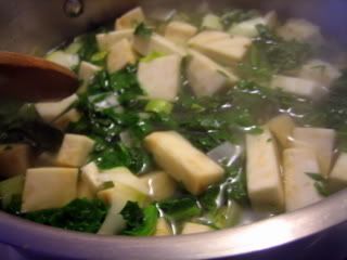 When Craig comes for dinner, he usually cooks it too! Tonight he made Cream of Celeriac, Spinach and Leek Soup. This is a vegetarian soup, with no cream...but pureeing it at the end with a handblender gave it a creamy texture. The house smelled wonderful as it cooked.
