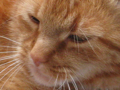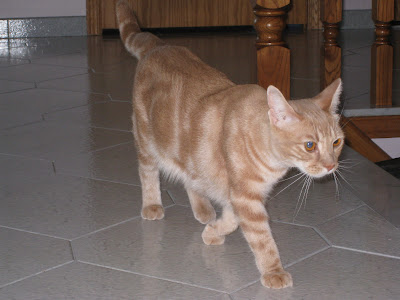 A visit home wouldn't be the same without Karen's cats. Above is Charlie, the homeless fellow who adopted my sister and her family. He is quite content here, but stays clear of Cinder (photo below), their younger wilder kitten. She likes to jump on Charlie's back. But then, I think he gets her back by eating her food.