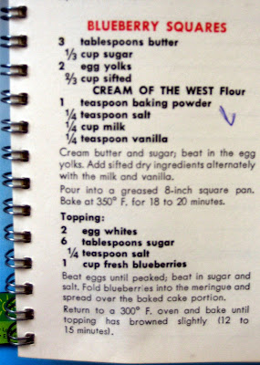 The recipe is called Blueberry Squares, but to me, squares are chewy little things like brownies or coconut gooey sweet things you find at showers and church socials. To me, this is cake. Not layer cake, just good family cake that you serve from the cake pan! So I rename this recipe Blueberry Meringue Cake.