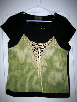Clothing article is a new top I bought in the Beaches a few weeks ago. It is "different, as in haven't seen it in any other store," and best of all it was on sale. I have worn it often and get lots of nice comments every time I wear it. It is one piece,, but the laced cami looks separate. Looks great with denim skirt, jeans or black pants.