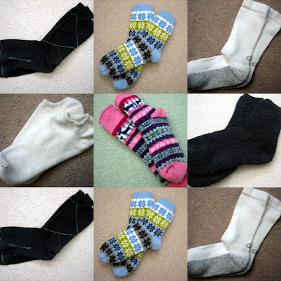 Here's my socks Mona, not very interesting because I don't pay a lot of attention to my socks. Mostly I wear stockings or knee-highs. I wear socks instead of slippers sometimes or I wear them in the house when my feet are cold...so most of these here are thick, fuzzy, soft, and very warm. The white ones are worn with running shoes...I like the short ones that don't show outside the shoe. There is a pair of black Tommy Hilfiger socks that have a grey and red line; I wear these with black pants and a red sweater.